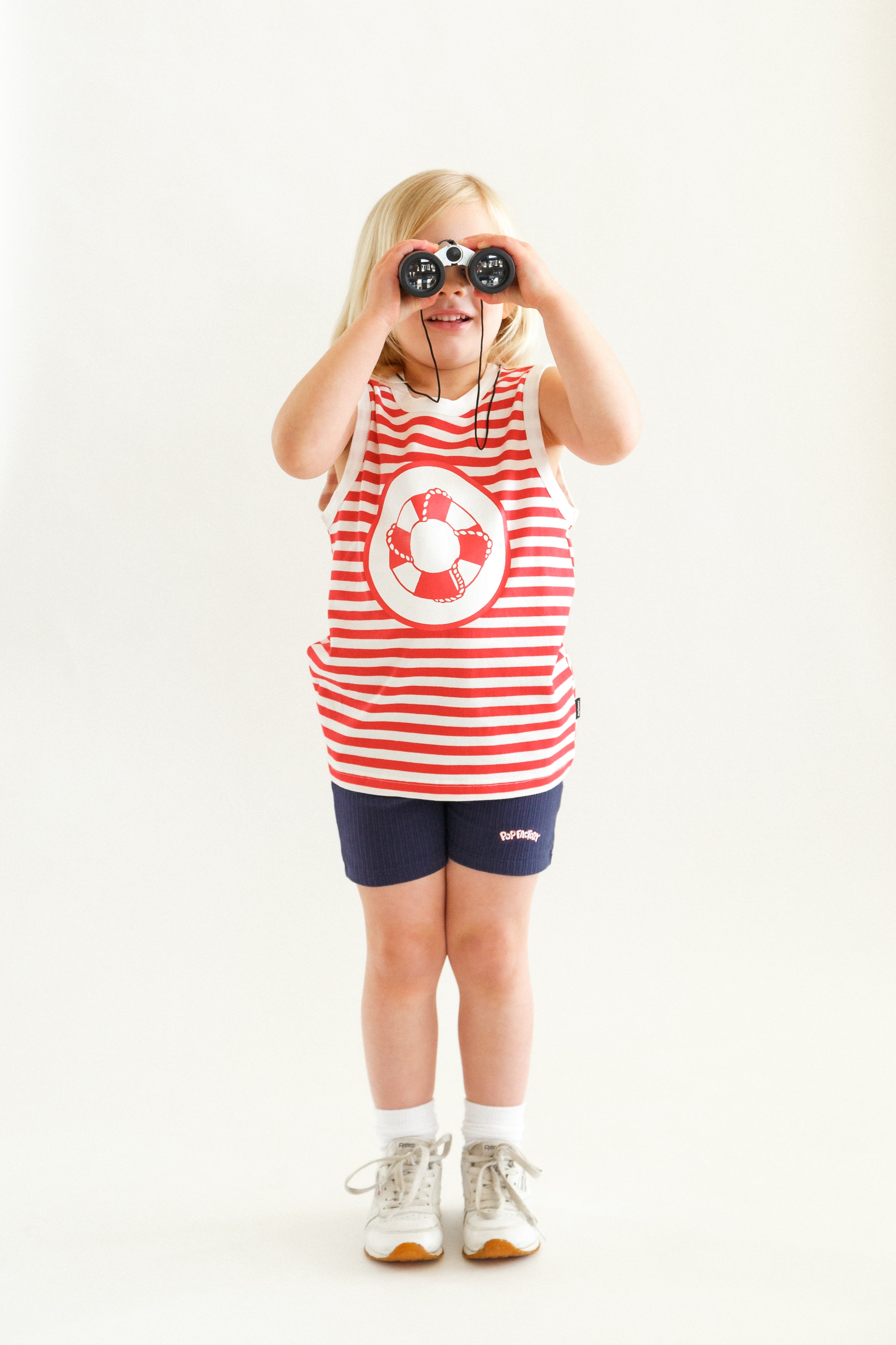 Pirate Stripe Singlet with our PF 'Lifering' Print in Red and White A relaxed fit for comfort and style, no need to size up! Cotton/Elastane Designed in Aotearoa, New Zealand...