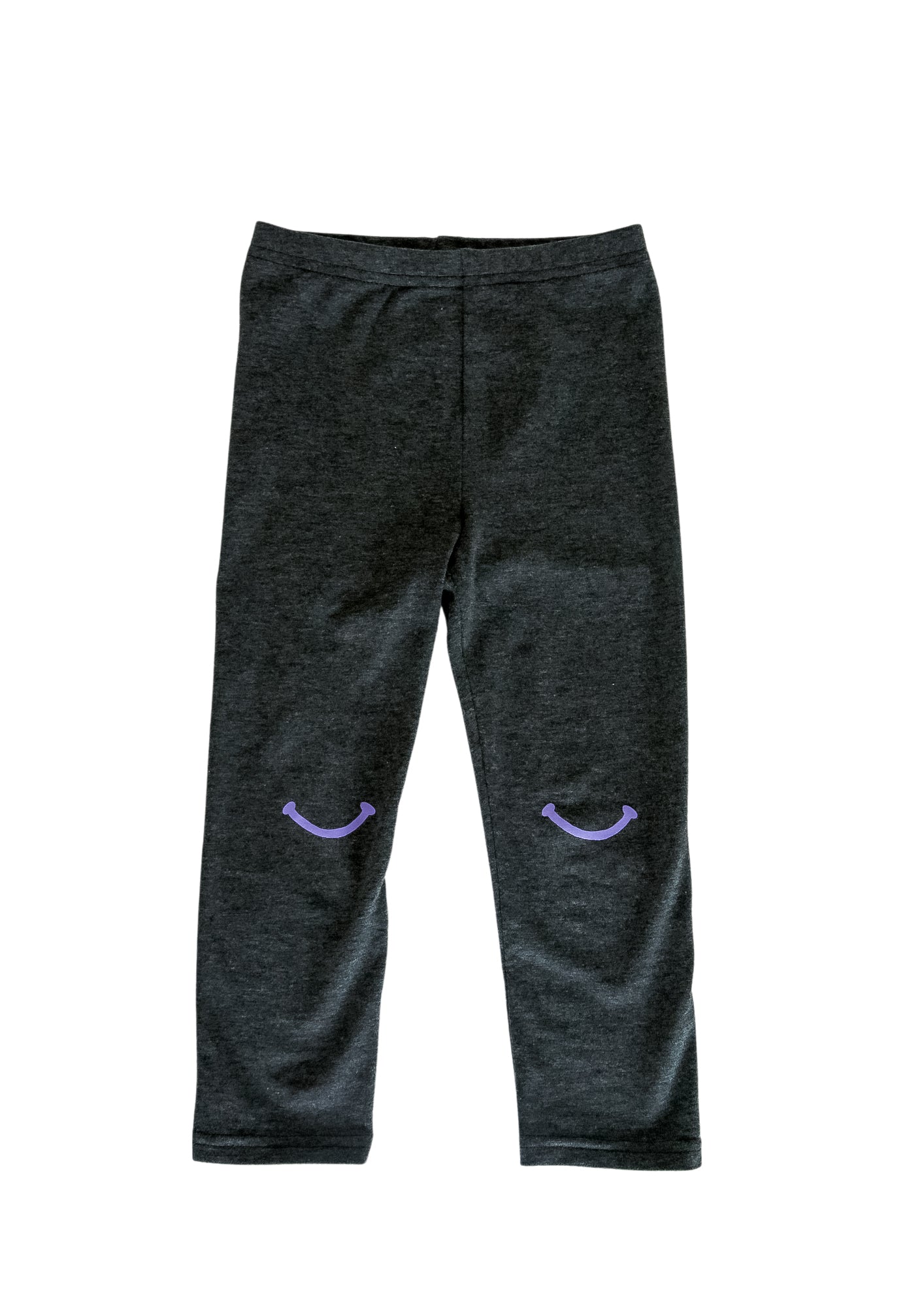 Smiley Leggings in Charcoal with PF lilac 'smiley' print on the knees True to size Cotton/Elastane 190gsm Designed in Aotearoa, New Zealand Measurements:1/2 Waist (Elastic Relaxed) CM1-2 - 203-4 -...