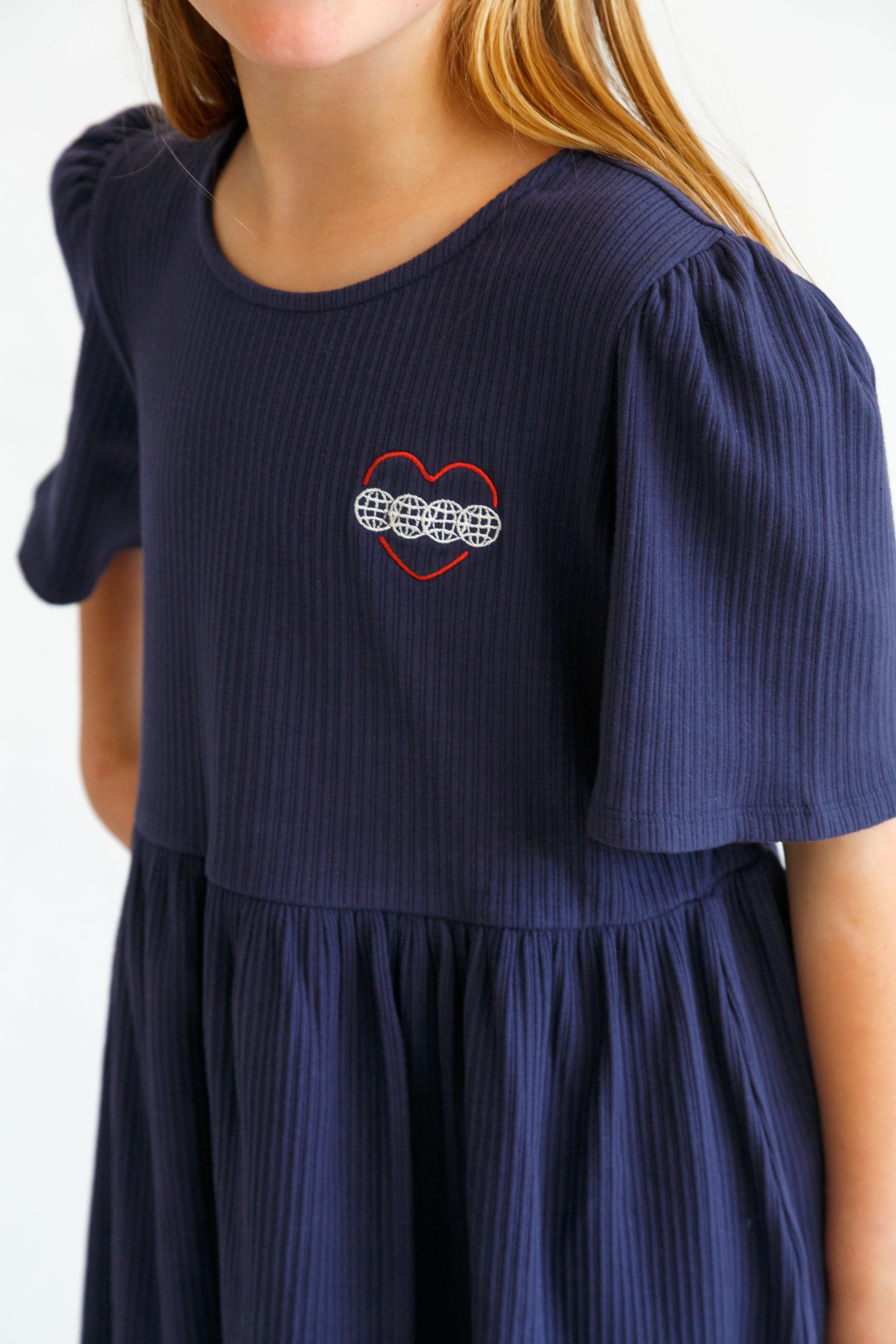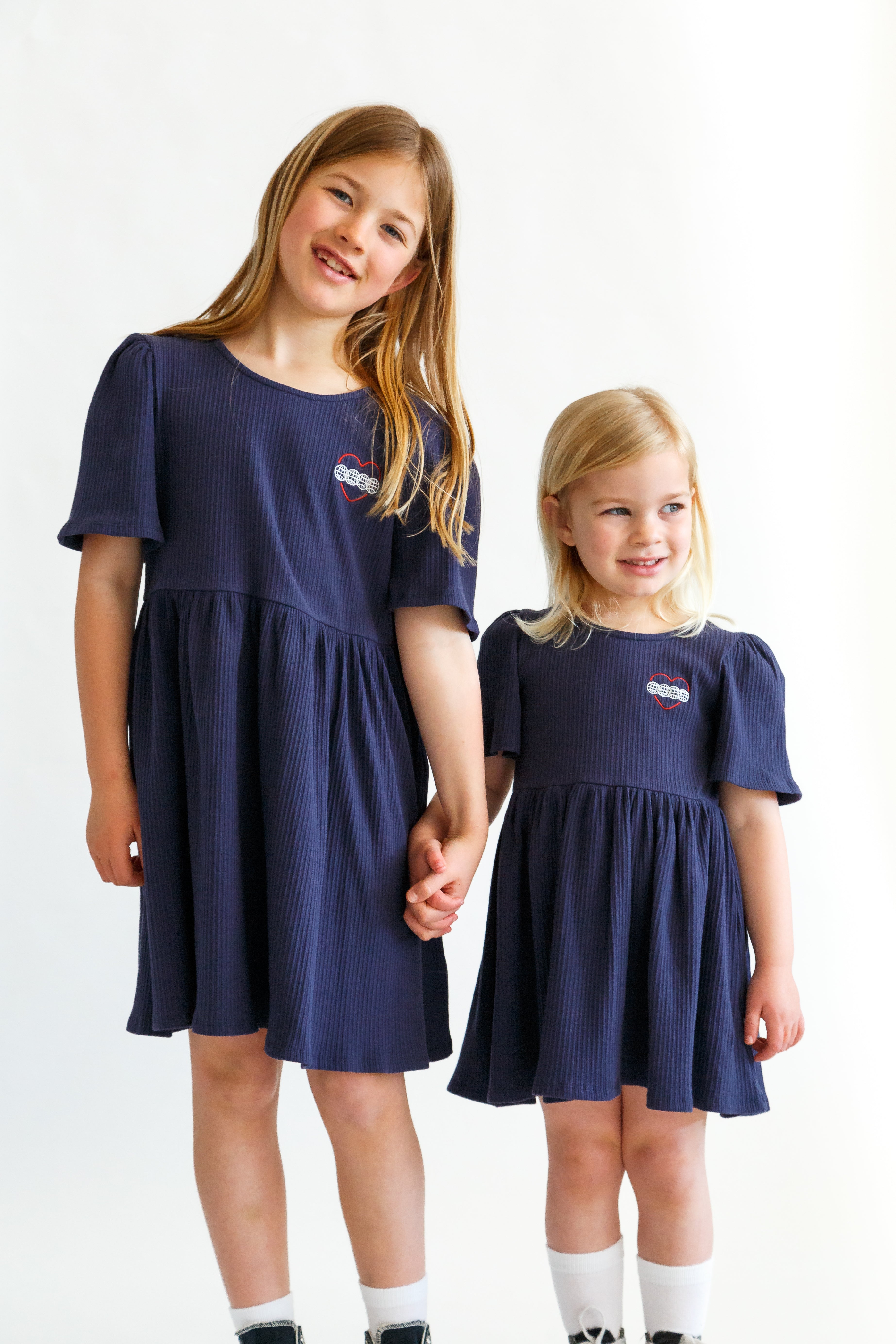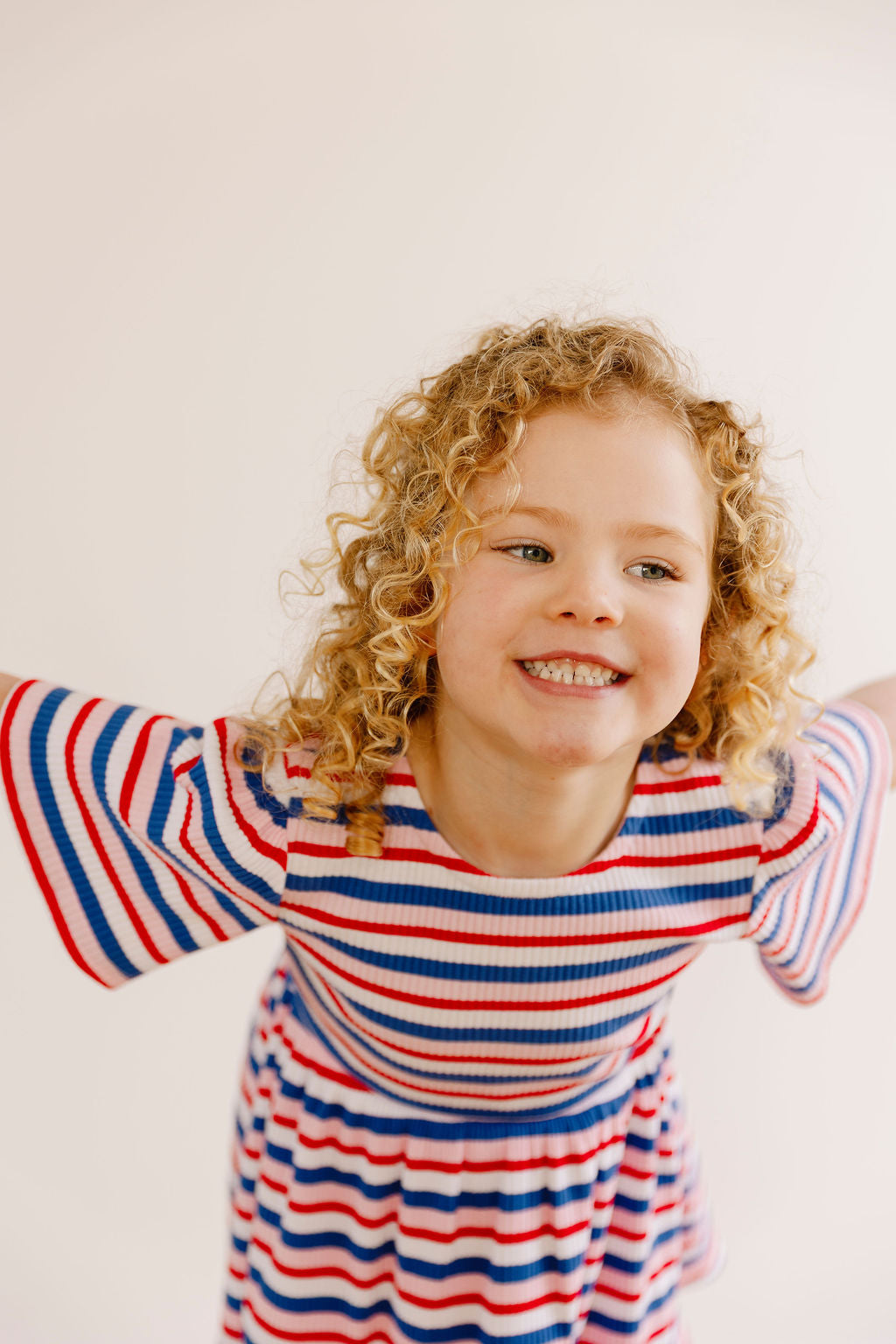Traveller Stripe Dress Cotton/Elastane 210gsm Rib Floaty sleeves and a full skirt for twirling Designed in Aotearoa, New Zealand Measurements:1/2 Chest (Underarm to Underarm) CM1-2 - 27.53-4 - 305-6 -...