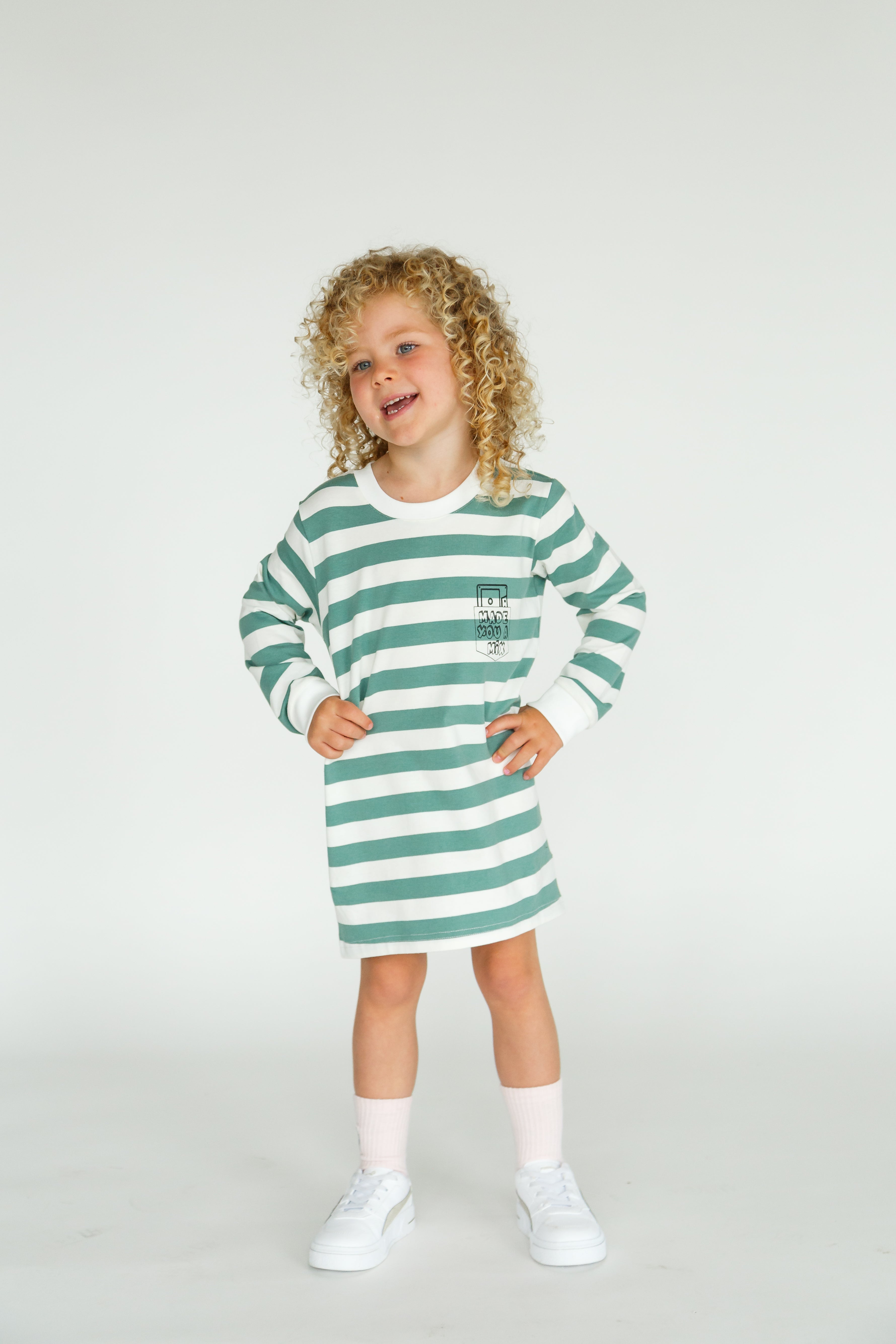 Sage Stripe Long Sleeve Dress with PF 'mix tape' print A relaxed fit for comfort and style, no need to size up! Cotton/Elastane 185gsm Designed in Aotearoa, New Zealand Measurements:1/2...